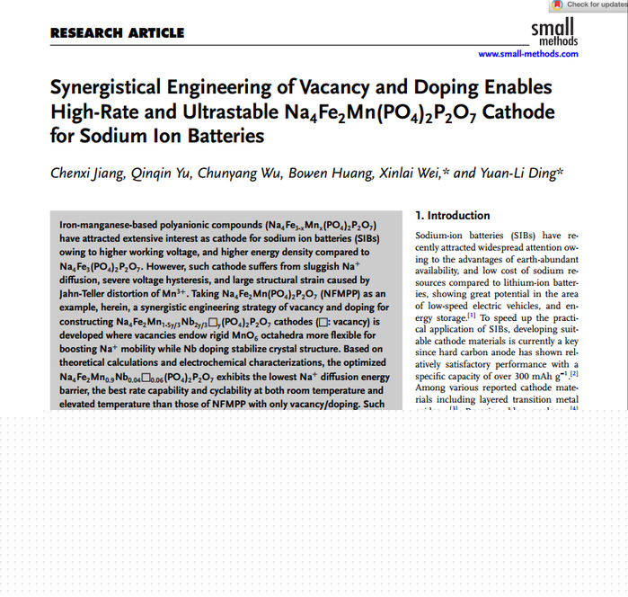 近日,我校生物食品與環境學院2022級資源與環境專業研究生蔣晨熙以第一作者在國際學術期刊《Small Methods》(IF=10.7,中科院二區)發表了題為“Synergistical Engineering of Vacancy and Doping Enables High-Rate and Ultrastable Na4Fe2Mn(PO4)2P2O7 Cathode for Sodium Ion Batteries”的研究論文。我校高級實驗師衛新來、湖南大學教授丁元力為通訊作者,合肥大學為第一完成單位。