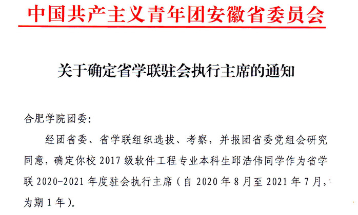 按照《安徽省學生聯合會章程》有關規定,團省委、省學聯于6月啟動2020-2021年度省學聯駐會執行主席的遴選工作。經過團省委、省學聯組織選拔、考察并報團省委黨組會研究同意,邱浩偉同學從安徽省各高校候選人中脫穎而出,當選為安徽省學聯2020-2021年度駐會執行主席,這也是我校學生首次當選省學聯駐會執行主席。