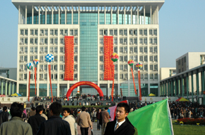 11月20日,合肥學院南校區內彩旗招展,教學主樓廣場前“2006年安徽高校畢業生綜合類就業市場”的巨幅彩虹門格外顯眼,主干道兩邊草地上“工業立市、科技創新”、“育人為本,德育為先,教學為綱”的彩色展板彰顯我市走工業化道路和我院人才培養戰略的信心和前景。