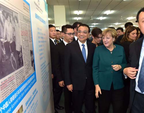 雖然展覽只有200多米的路程,但兩國總理一路聊一路看走了20多分鐘。他們途徑一間閱覽室看到有學生自習,又折返回來走進去與圍攏過來的大學生交流。李克強詢問了學生們的學習情況,默克爾則用德語說:“祝你們在以后的學習中一切都好。”