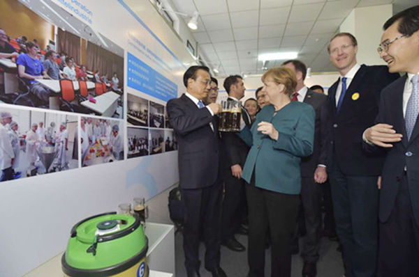 一桶德國啤酒也出現在展覽現場。原來,過去該校食品專業的學生只會釀造黃啤,在德國師生的幫助下,后來釀起了黑啤。興致盎然的李克強和默克爾不由舉起酒杯,品嘗起中德合釀的美酒。
