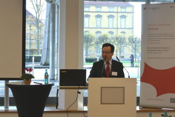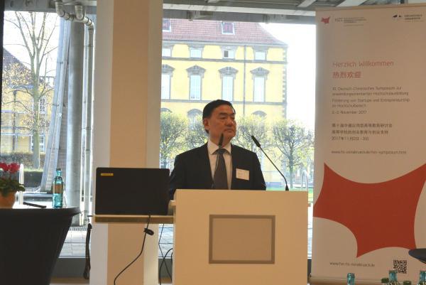 Herr Prof. Dr. Thomas Steinkamp, Vizepr?sident der Hochschule Osnabrück, erw?hnte in seiner Rede zuerst die Kooperationen mit der Universit?t Hefei, vor allem die effektiven Ergebnisse im Fach LogIn China. Dann sagte er, dass sich die Hochschulen in China und in Deutschland heutzutage mit dem gemeinsamen Problem konfrontiert sehen, wie den Studierenden geholfen werden k?nne, sich auf die wechselvolle Arbeitsumwelt vorzubereiten. Durch die innovations- und gründungsorientierte Lehre der Hochschulen kann die F?higkeit der Studierendenzu Innovationen und Unternehmensgründungen gef?rdert werden.