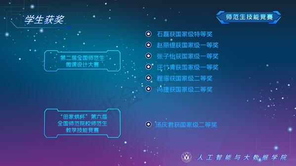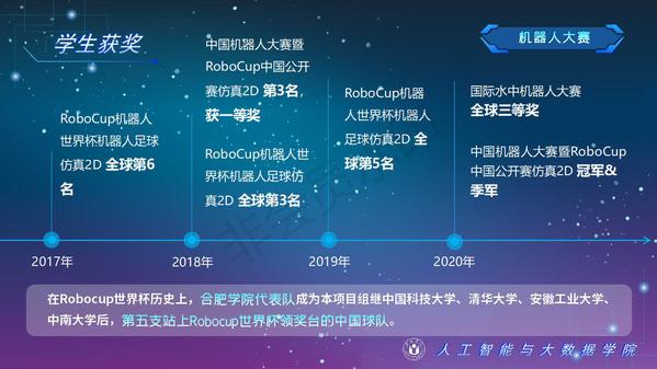 人工智能與大數據學院緊緊圍繞學校人才培養中心工作,2012年以來積極開展以學生科技創新創業為主的第二課堂工作,以學生“能力水平、專業類別和興趣愛好”為根本出發點,目前成立了: RoboCup機器人足球、數學建模、AR/VR團隊、物聯網創新設計、移動應用開發、ACM-ICPC算法設計、仿人機器人、水下機器人、區塊鏈、網絡與信息安全等16支團隊,并且專門建設了機器視覺應用、數學建模與仿真等6個學生創新實驗室、移動APP開發、多智能體系統、數據分析與仿真等8個大學生創客中心;為各團隊提供良好的環境和資源。通過這些工作的開展,人工智能與大數據學院大學生的創新創業能力逐步增強,目前有200余人常駐創新創業實驗室。近五年在師生共同努力下,在各類競賽中共獲獎800項,其中國際級21項,國家級獎項160余項、省級獎項600余項。RoboCup機器人2D仿真足球隊連續5次進入世界杯前8強,先后獲得葡萄牙公開賽冠軍、世界杯季軍等國際獎項,是世界杯、中國機器人足球賽公認強隊;此外獲得中國機器人大賽暨RoboCup公開賽曾獲得國家特等獎1項、美國大學生數學建模競賽獲得國際二等獎6項,全國大學生數學建模競賽獲得國家二等獎1項,CCPC中國大學生程序設計競賽總決賽銀牌,Robocup機器人世界杯中國賽獲得亞軍,“哈工大杯”第十六屆全國機器人錦標賽暨“博思威龍杯”第五屆國際仿人機器人奧林匹克大賽獲得國家一等獎2項,“藍橋杯”全國軟件和信息技術專業人才大賽個人賽曾獲得國家一等獎2項,“田家炳杯”第六屆全國師范院校師范生教學技能競賽國家二等獎、第二屆全國師范生微課設計大賽國家特等獎等。獲批大學生創新創業訓練計劃項目國家級86項,省級168項,獲批大學生創客實驗室項目8項,2名優秀學生獲得安徽省“創新之星”榮譽稱號。