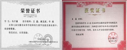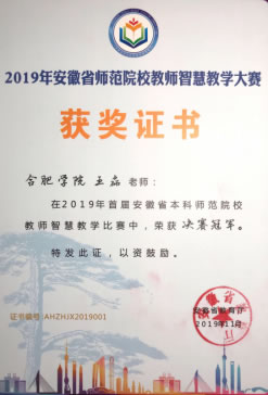 此外,在培養(yǎng)師范生教學(xué)技能的同時,數(shù)學(xué)與應(yīng)用數(shù)學(xué)專業(yè)的老師也在不斷地加強教學(xué)技能、豐富教學(xué)手段、更新教學(xué)理念。在2019年首屆安徽省本科師范院校教師智慧教學(xué)大賽(決賽)中,師范生指導(dǎo)團隊負責(zé)人王磊副教授作為我校唯一選派選手,力拔頭籌,獲得安徽省總冠軍。 人工智能與大數(shù)據(jù)學(xué)院師生始終緊跟教育改革步伐,在省級師范教學(xué)比賽上取得如上成績,踐行了我校地方性、應(yīng) 用型的辦學(xué)理念,也是數(shù)學(xué)與應(yīng)用數(shù)學(xué)專業(yè)積極推廣“以學(xué)生為中心”的課堂教學(xué)模式的集中體現(xiàn)。
