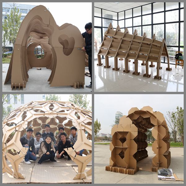 自2015年十月起,每年都可以在二區41棟南側小廣場上發現一些造型各異的“建筑”。這些“建筑”十分特殊,全部由再生瓦楞紙板搭建而成,而這也是建工系的富有專業特色的“瓦楞紙板建造大賽”。這一活動一經提出便引起同學們的廣泛關注并積極參與。在今年的第二屆比賽中,共有百余位建筑學同學參與其中,共計完成二十余組富有一定創意的作品,而舉辦這項活動的提出者正是陶峰。他表示,舉辦這項比賽既能提高同學們的動手能力又能提高同學們的創造力、合作能力,可謂一舉多得。“紙上得來終覺淺,絕知此事要躬行。”同學們通過參與此項大賽,自己策劃,實際操作,親手構造,對建筑的建造方式及建造過程獲得很好的感性和理性認識,同時通過空間活動體驗,初步把握建筑的使用功能、空間形態以及建筑的基本要求,培養同學們的思考鉆研,直面困難、解決困難的精神。