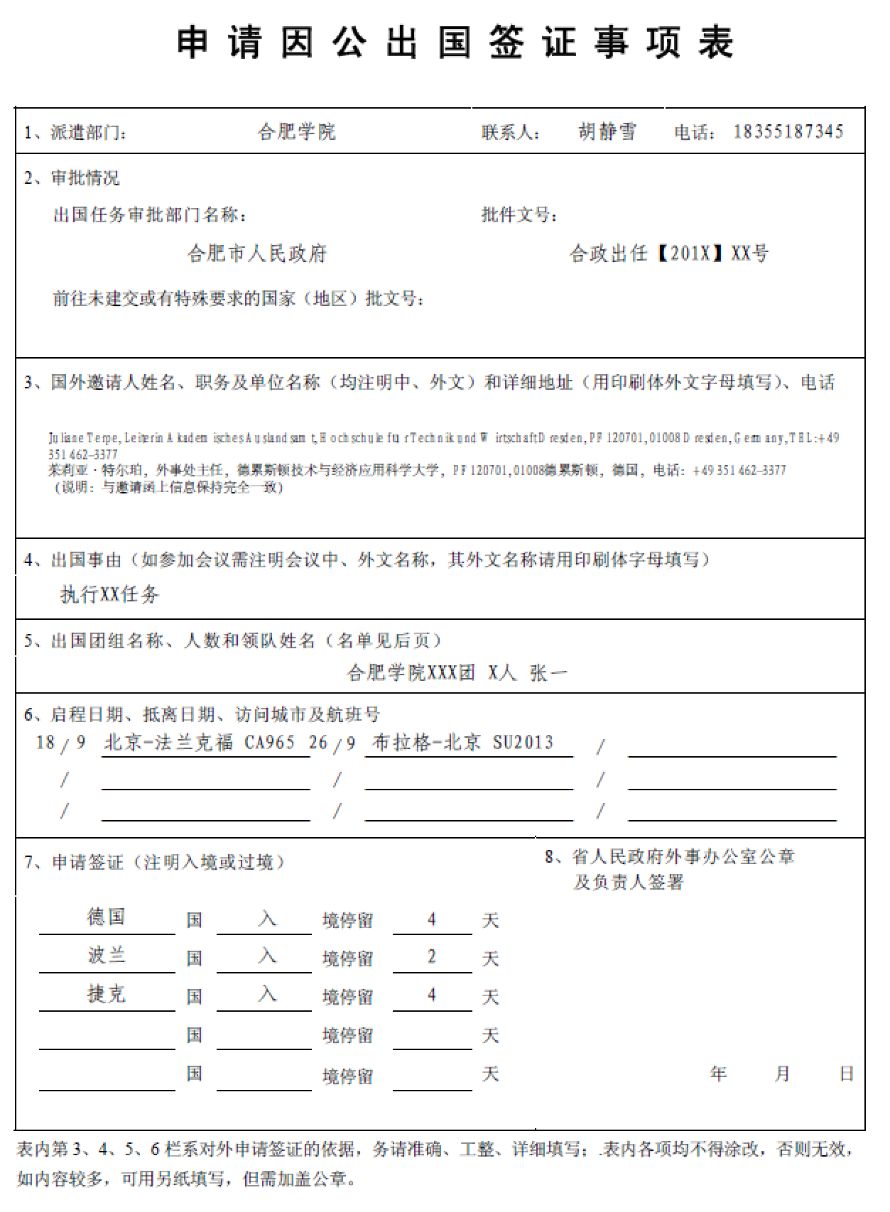 申請因公出國簽證事項表
