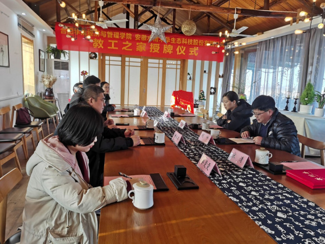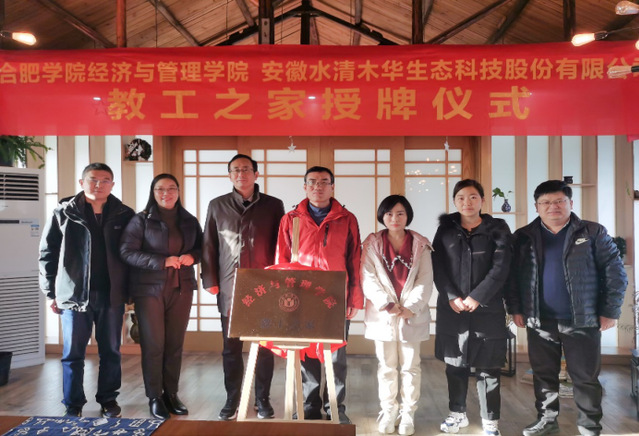 2021年12月17日,合肥學院經濟與管理學院以及安徽水清木華生態科技股份有限公司“教工之家”授牌儀式于安徽水清木華生態科技股份有限公司會議室舉行。參加本次授牌儀式的有:合肥學院工會主席崔國慶、合肥學院經濟與管理學院黨委書記、工會主席楊學春、黨委副書記張永軍、副院長、工會副主席吳悅;肥東縣白龍鎮黨委副書記、工會主席王慧敏;安徽水清木華生態科技股份有限公司執行總裁胡坤等。