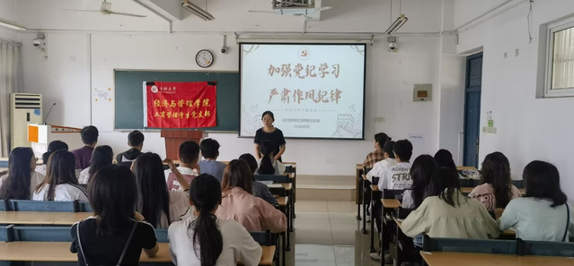 2024年6月7日經濟與管理學院工商管理學生黨支部在一期4棟301教室開展“加強黨紀學習,嚴肅作風紀律”主題黨課,支部書記姚璇老師帶領全體黨員學習《中國共產黨紀律處分條例》。
