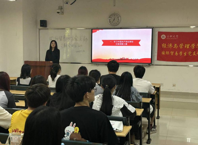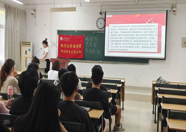 為激發入黨積極分子的愛國熱情,強化服務擔當意識,各黨支部于5月中旬聯系第十期各專業的入黨積極分子分別開展了內容豐富的主題黨日活動。 工商管理學生黨支部組織入黨積極分子交流研討了《中國共產黨紀律處分條例》,入黨積極分子就《條例》中的內容進行了分享與交流。會計學學生黨支部負責人為入黨積極分子詳細介紹了《條例》的背景與內容,強調了黨組織紀律的重要性。經濟學學生黨支部組織入黨積極分子集中觀看了介紹黨章黨規的相關視頻,并學習了《條例》相關內容。國際貿易學生黨支部組織入黨積極分子深入學習了《條例》第三章的內容。金融學學生黨支部負責人帶領入黨積極分子學習了《條例》第一章總則的相關內容。物流與供應鏈學生黨支部帶領入黨積極分子學習了《條例》新增、修改的重點條文,隨后開展了黨員先鋒小課堂活動。研究生黨支部重點對《條例》中違紀與紀律處分、紀律處分運用規則等內容進行了學習。 此次培訓,加強了入黨積極分子與正式黨員之間的交流,通過實踐活動的形式提升入黨積極分子的黨性修養和實踐能力,對于進一步加強黨員教育管理、提升黨員隊伍質量具有重要意義。 (經濟與管理學院撰稿人:耿權龍 初審:王晨森 復審:余宏強終審:倪澤強)