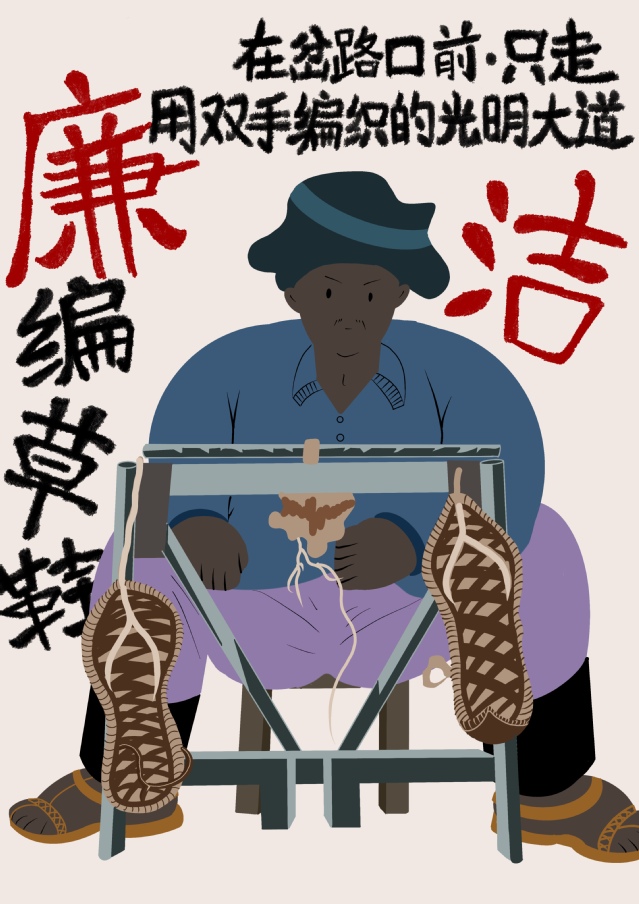 作品圍繞“反腐廉潔”進行創作,運用了三位手工藝人的形象對貪污腐敗的人進行反諷;將腐敗不正之風的人不會有的生活方式直接寫了出來,同時使用扁平畫的風格將生活中最樸素人物的真實的狀態表現出來,字體偏手寫風格,充滿親和力,“廉潔”兩字使用紅色更加突出。