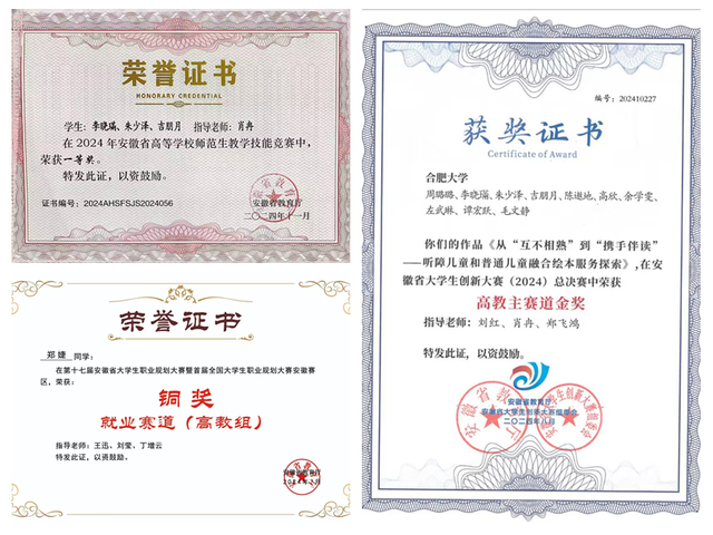 此前,在2024年安徽省高等學校師范生教學技能競賽中,我院教師指導的6組選手斬獲1個一等獎、1個二等獎、2個三等獎和2個優(yōu)勝獎;1組選手在安徽省大學生創(chuàng)新大賽(2024)總決賽中榮獲高教主賽道金獎;2組選手在第十一屆“挑戰(zhàn)杯?華安證券”安徽省大學生創(chuàng)業(yè)計劃競賽、第十七屆安徽省大學生職業(yè)規(guī)劃大賽中分別榮獲銅獎。