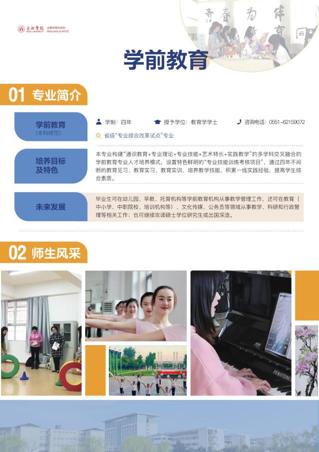 學前教育(本科 師范) 咨詢電話:0551-62159072 省級“專業綜合改革試點”專業 學制:四年 授予學位:教育學學士 培養目標及特色:本專業構建“通識教育+專業理論+專業技能+藝術特長+實踐教學”的多學科交叉融合的學前教育專業人才培養模式,設置特色鮮明的“專業技能訓練考核項目”,通過四年不間斷的教育見習、教育實習、教育實訓,培養教學技能,積累一線實踐經驗,提高學生綜合素質。 畢業生發展方向:畢業生可在幼兒園、早教、托育機構等學前教育機構從事教學管理工作,還可在教育(中小學、中職院校、培訓機構等)、文化傳媒、公務員等領域從事教學、科研和行政管理等相關工作;也可繼續攻讀碩士學位研究生或出國深造。
