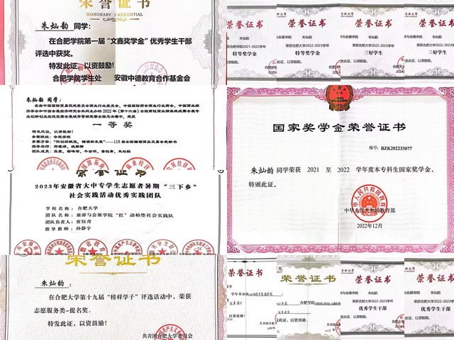 朱燦韻始終將學(xué)業(yè)作為立身之本。她連續(xù)兩年斬獲“國(guó)家獎(jiǎng)學(xué)金”、校級(jí)“特等獎(jiǎng)學(xué)金”,并獲評(píng)“三好學(xué)生”“優(yōu)秀學(xué)生干部”“優(yōu)秀團(tuán)員”等榮譽(yù)稱號(hào)。她積極參與學(xué)科競(jìng)賽,在第十六屆全國(guó)高校商業(yè)精英挑戰(zhàn)賽中帶領(lǐng)團(tuán)隊(duì)以“未來(lái)概念+糖酒會(huì)”的創(chuàng)新方案榮獲國(guó)家一等獎(jiǎng),為合肥市會(huì)展業(yè)發(fā)展注入科技活力。此外,她在“互聯(lián)網(wǎng)+”大學(xué)生創(chuàng)新創(chuàng)業(yè)大賽中三度獲獎(jiǎng),項(xiàng)目涵蓋徽州木雕盲盒、農(nóng)旅融合、智慧旅游平臺(tái)等方向,以創(chuàng)新思維助力鄉(xiāng)村振興與行業(yè)發(fā)展。