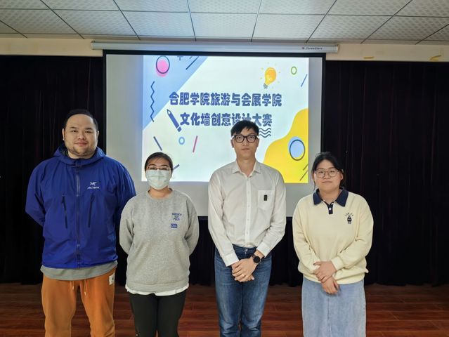 首先由兩位主持人介紹本次校園文化墻決賽規則:每支參賽隊伍對本隊的文化墻設計方案進行六分鐘以內的演講。然后,由三位評委對選手作品提出相關問題并對其作品提供修改意見。最后,根據評委的綜合打分決出名次。主持人宣布比賽正式開始后,四支隊伍依次上臺介紹文化墻設計方案,每支隊伍都顯現出了各自的特色。講解完后,評委們對每隊做出點評和改進的建議。經過認真嚴謹的評選,馬踏飛燕隊榮獲一等獎,九十九朵玫瑰送給你隊榮獲二等獎,啊對對隊與皖風皖韻隊榮獲三等獎。每支隊伍與評委合影留念后,旅游與會展學院校園文化墻比賽決賽圓滿結束。