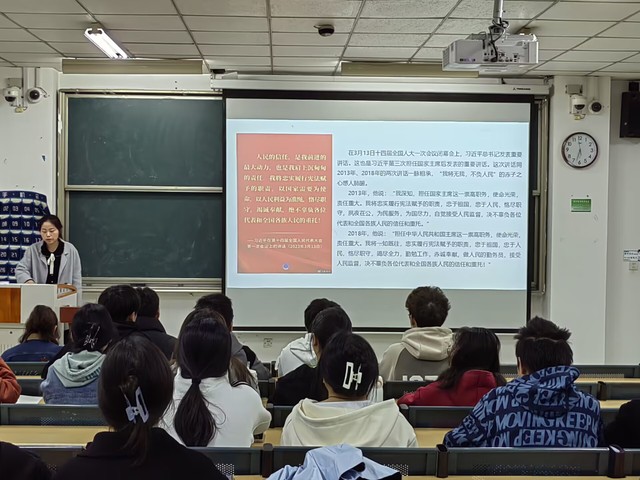 本次會議由董敏老師主講。首先,她講述習近平總書記第三次擔任國家主席后發表的重要講話,“我將無我,不負人民”是習近平總書記在意大利眾議長菲科提問時的回答,深刻反映他愛民的一腔赤誠、為民的真摯情懷。接著,她著重介紹習近平總書記七年的知青歲月,讓同學們加深對習近平總書記人民情懷的了解,也更加堅定同學們為祖國繁榮奉獻青春的信心和決心。最后,她指出人民立場是馬克思主義政黨區別于資產階級政黨的顯著標志并通過中國抗疫“以人民至上、生命至上”與美國抗疫注重“自由”“民主”“人權”的對比充分表明全心全意為人民服務是黨的根本宗旨,中國共產黨為人民的美好生活而不懈奮斗。
