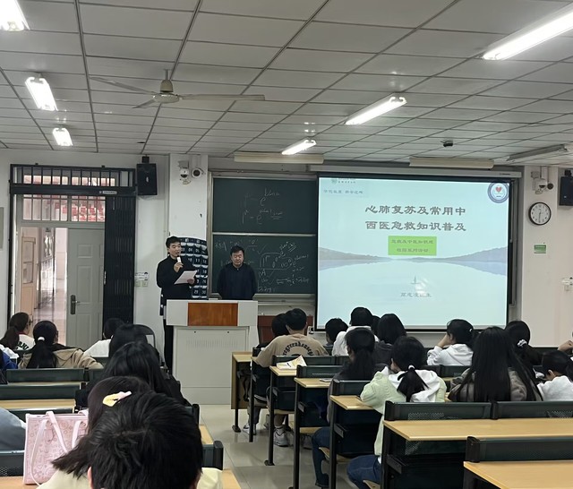 高志凌醫(yī)師以“心肺復(fù)蘇及常用中西醫(yī)急救知識(shí)普及”為主題,從簡(jiǎn)易止血術(shù)、燙傷、現(xiàn)代心肺復(fù)蘇術(shù)、海姆立克急救法、保健穴位五個(gè)方面向大家講述常用醫(yī)療知識(shí)。首先,他將觸電、溺水、摔傷出血、燙傷等突發(fā)性情況與課件結(jié)合向學(xué)生們介紹簡(jiǎn)易的止血術(shù),讓大家對(duì)急救知識(shí)有了一個(gè)基本的認(rèn)識(shí)。接著,高醫(yī)師圍繞心肺復(fù)蘇、海姆立克等內(nèi)容進(jìn)行詳細(xì)講解,介紹應(yīng)急救護(hù)的基本概念以及掌握應(yīng)急救護(hù)知識(shí)技能對(duì)于贏取救治時(shí)間、挽救生命的關(guān)鍵性作用,重點(diǎn)強(qiáng)調(diào)在各種原因?qū)е?/span>下的心搏驟停,必須在在4~6分鐘內(nèi)采取的急救措施。緊接著,他結(jié)合生活實(shí)際,生動(dòng)形象地講述神門穴、內(nèi)關(guān)穴等神奇的穴位的功用。