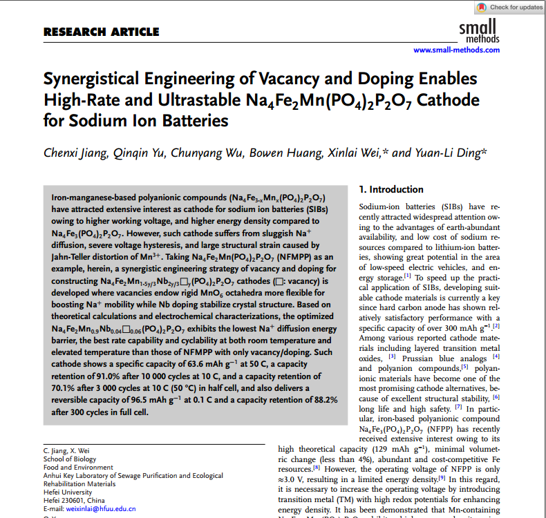 20255月,合肥大學生物食品與環境學院22級資源與環境專業研究生蔣晨熙以第一作者身份在國際學術期刊《SmallMethods》(IF=10.7,中科院二區)發表了題為“SynergisticalEngineering of Vacancy and Doping Enables High-Rate and UltrastableNa4Fe2Mn(PO4)2P2O7Cathode for Sodium IonBatteries”的研究論文。我校高級實驗師衛新來、湖南大學教授丁元力為通訊作者,合肥大學為第一完成單位。