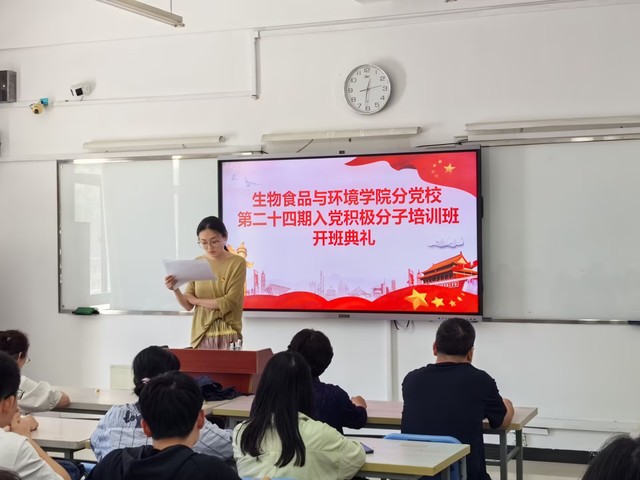 2025年5月12日12時30分,生物食品與環境學院分黨校入黨積極分子培訓班開學典禮在生-214教室舉行,由培訓班班主任趙暮雨主持,院黨委書記李秀娟,院黨委副書記、副院長(主持工作)阮班鋒,院黨委副書記晉松以及全體入黨積極分子參與。