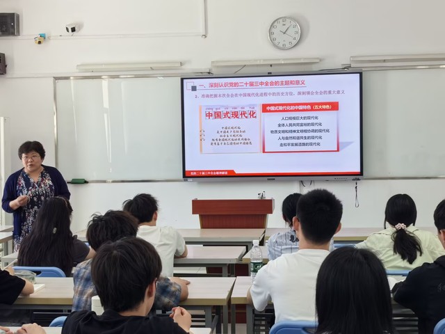 首先,李秀娟深入闡述了黨的二十屆三中全會的主題和重要意義。她指出,全會聚焦全面深化改革,明確了新時代改革的方向和任務,為推動國家發展提供了重要指引。她強調,全會的指導思想是堅持以習近平新時代中國特色社會主義思想為指導,立足新發展階段,貫徹新發展理念,構建新發展格局,推動高質量發展。隨后,李秀娟進一步講解了全面深化改革的總目標和重大原則。她指出,總目標是完善和發展中國特色社會主義制度,推進國家治理體系和治理能力現代化。同時,改革必須堅持黨對改革的集中統一領導,堅持改革沿著中國特色社會主義方向前進,堅持社會主義市場經濟改革方向,堅持改革為了人民、依靠人民,這些原則為改革的順利推進提供了堅實保障。最后,李秀娟著重強調了大學生在貫徹落實黨的二十屆三中全會精神中的責任與使命,要深刻理解習近平總書記提出的“六個力”的豐富內涵,即思政引領力、人才競爭力、科技支撐力、民生保障力、社會協同力、國際影響力,要求全體需要圍繞這“六個力”深入思考,深刻領悟全會精神,將個人理想融入國家發展大局,努力學習科學文化知識,提高自身綜合素質,積極投身社會實踐,為實現中國式現代化貢獻自己的力量。