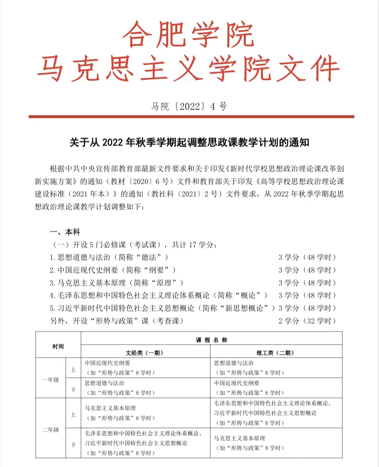 關于從 2022 年秋季學期起調整思政課教學計劃的通知(馬院〔2022〕4 號)