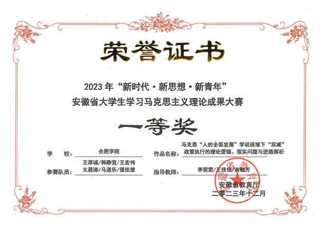我校學(xué)子在2023年“新時(shí)代·新思想·新青年”安徽省大學(xué)生學(xué)習(xí)馬克思主義理論成果大賽中獲得一等獎(jiǎng)