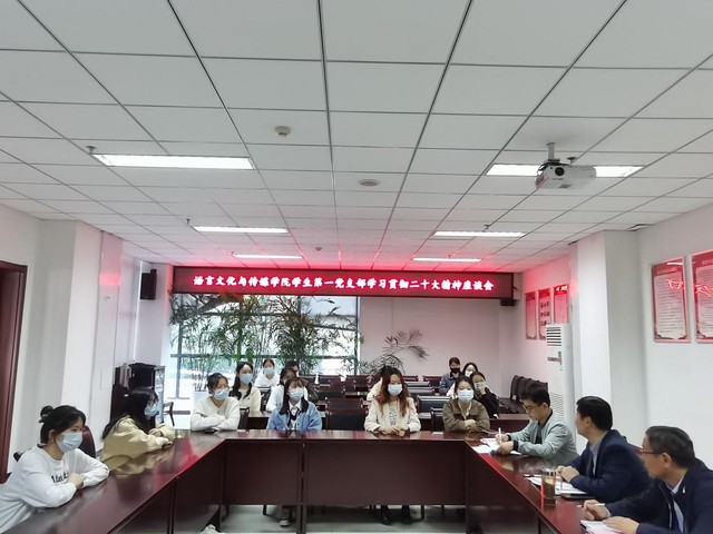 111日下午,校黨委委員、黨委學工部部長、黨委武裝部部長、學生處處長朱濤到聯系支部語言文化與傳媒學院學生第一黨支部宣講黨的二十大精神。語言文化與傳媒學院黨委書記儲昭輝、黨委委員、副院長殷明明陪同參加,宣講活動由支部書記劉政主持,支部全體黨員參加。