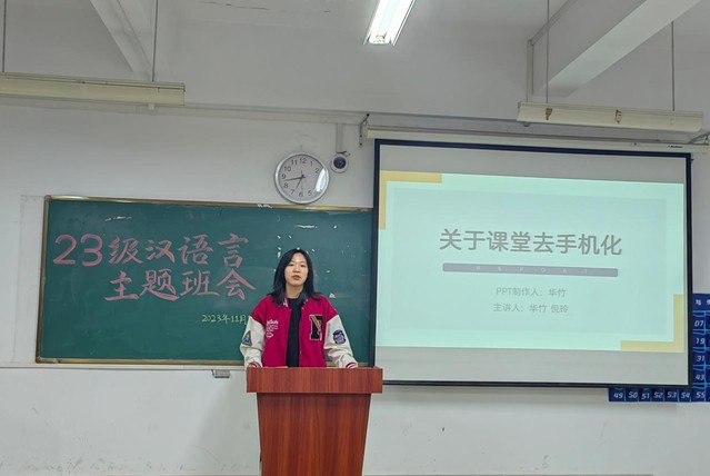 本次班會主要分為兩個內容。首先,班長魯同德對文傳學院“抓學風新措施”作出安排,要求以寢室為單位,訂立寢室公約,并上交至輔導員審核,審核完成后張貼在寢室內貫徹落實。這一舉措的作用將在宿舍衛生,安全,紀律,宿舍成員關系方面體現:在衛生方面,寢室公約可以增強講衛生觀念,提高講衛生意識;在安全方面,可以減少宿舍失竊風險,保護宿舍成員財產及人身安全;在紀律方面,可以規范宿舍成員言行舉止,營造和諧互助寢室氛圍。在宿舍成員關系方面:可以有效規避舍友之間的摩擦及沖突,防患于未然。最后,魯同德提出:在寢室公約訂立之后,所有成員應知約,記約,守約,公約的約束力不止在行為,更在每個舍員心中,只有將公約的紅線牢記于心,才能共創文明美好的規范寢室。在第二部分,學習委員華竹針對班級現有問題,即課堂上手機使用過度導致同學們聽課效率低,老師教學進度放緩的現象,提出了“課堂去手機化”提議,并以此向同學們提出幾點要求:首先是自我監督,以個人為單位進行自我約束,確保在上課時手機離手,專心聽課;其次是互相監督,周圍同學在必要時提醒不必要使用手機的同學。