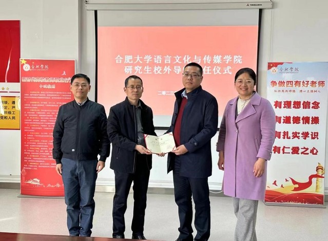 為進一步推進人才培養(yǎng)和學術研究工作,提升碩士研究生培養(yǎng)質量,拓展研究生培養(yǎng)資源,完善協(xié)同育人機制,12月7日,語言文化與傳媒學院于一區(qū)善思樓C座大會議室順利舉行了研究生校外導師聘任儀式。安徽省安策智庫創(chuàng)始人陳丹、語言文化與傳媒學院院長丁增武、院黨委副書記張愛萍、副院長殷明明出席此次聘任儀式。